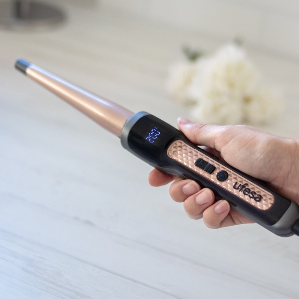 Níveis de Temperatura:9 Informações Adicionais:Estilizador cônico de 13-25mm2 em 1 ondas naturais e cachos compactosBarril com revestimento cerâmico com queratinaExtra brilho e maciez9 configurações de temperatura de 120-200℃Tela digital com indicador de temperaturaSistema de aquecimento com indicador digital grau um grau Azul "ligado" luz piloto Aquecimento rápido em 60 segundos Ponta fria de segurança Cabo giratório de 360ºC Cabo de 1,80m de comprimento
