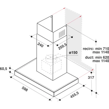 Com IVATipo de exaustor: T-Box Tipo de controlo: Contolo tátil Número de lâmpadas: 1 Número de velocidades: 7 Consumo Total Energia Anual (kWh): 53.2 NÃvel de ruÃdo (dBA): 60 Capacidade de extração (m3 h): 730 Capacidade de Recirculação de Ar na Função Boost: 365 Extracção máxima de ar de saÃda: 390 SaÃda máxima do ar de recirculação: 330 Potência acústica à velocidade máx. (2010 30 CE): 60 Material do filtro de gordura: Sintético lavável Tipo de Controlo Luminoso: On Off Classe de eficiência energética: A Cor: Inox Dimensões (AxLxP): 1140x598x455 mm