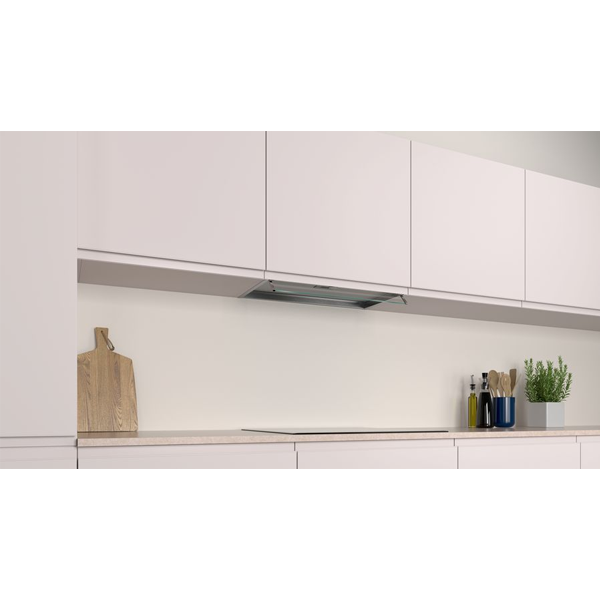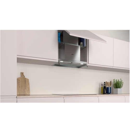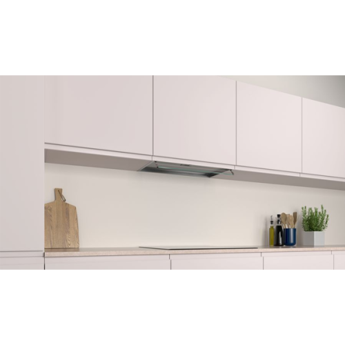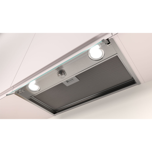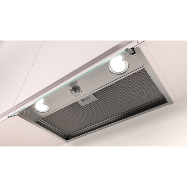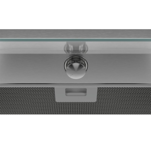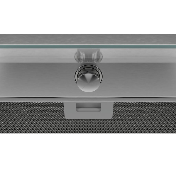 Box integrada (inox c controlo rotativo e painel frontal em vidro) Inox Classe de eficiência energética: A Controlo mecânico Vidro de proteção contra fumo e vapor Botão central oculto Iluminação LED 3 nÃveis Potência máxima de extração: 620 m3 h Potência sonora no nÃvel 3: 63 dB(A) Filtros de alumÃnio laváveis na máquina de lavar louça Válvula de retenção incluÃda Largura: 60cm