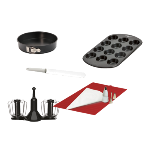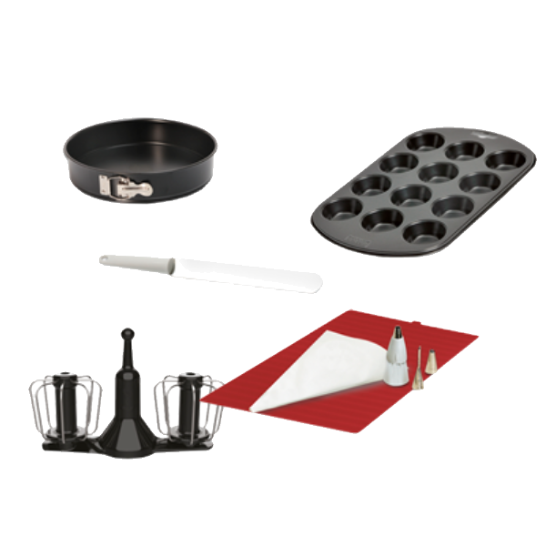 Com o kit de acessórios para pastelaria Companion, faça desde doces para o dia-a-dia aos mais sofisticados: macarons, merengues, mil-folhas, muffins, marshmallows, cheesecake, cremes, bolos, tartes, miniaturas, musses, pão-de-ló, pudins, pastéis, etc. | Faça as suas receitas com facilidade graças aos 6 acessórios do kit de acessórios para pastelaria Companion: um batedor de duas varras, um saco pasteleiro, uma forma com abertura antiaderente, uma forma para 12 muffins, um tapete de silicone e uma espátula. Graças ao batedor de duas varas, obtenha cremes bem firmes e cremosos.