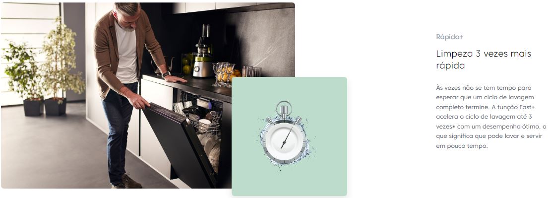 A função Fast+ acelera o ciclo de lavagem até 3 vezes* com um desempenho ótimo, o que significa que pode lavar e servir em pouco tempo.